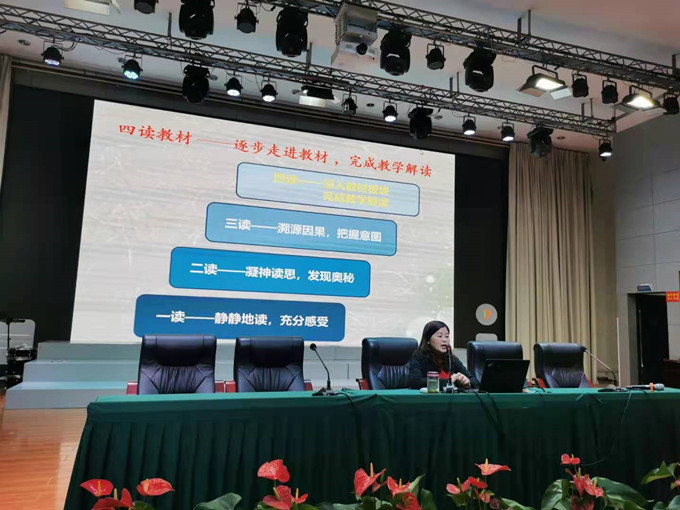 李老师就如何逐步走进教材,完成教学解读,提出了“四读教材”:一读,静静地读,充分感受;二读,凝神读思,发现奥秘;三读,溯源因果,把握意图;四读,深入教材板块,完成教学解读。如何将这“四读”落到实处,李老师又从教材单元编排体系、语言形式、插图、语文核心素养、单元语文要素等方面做了细致透彻的解读。