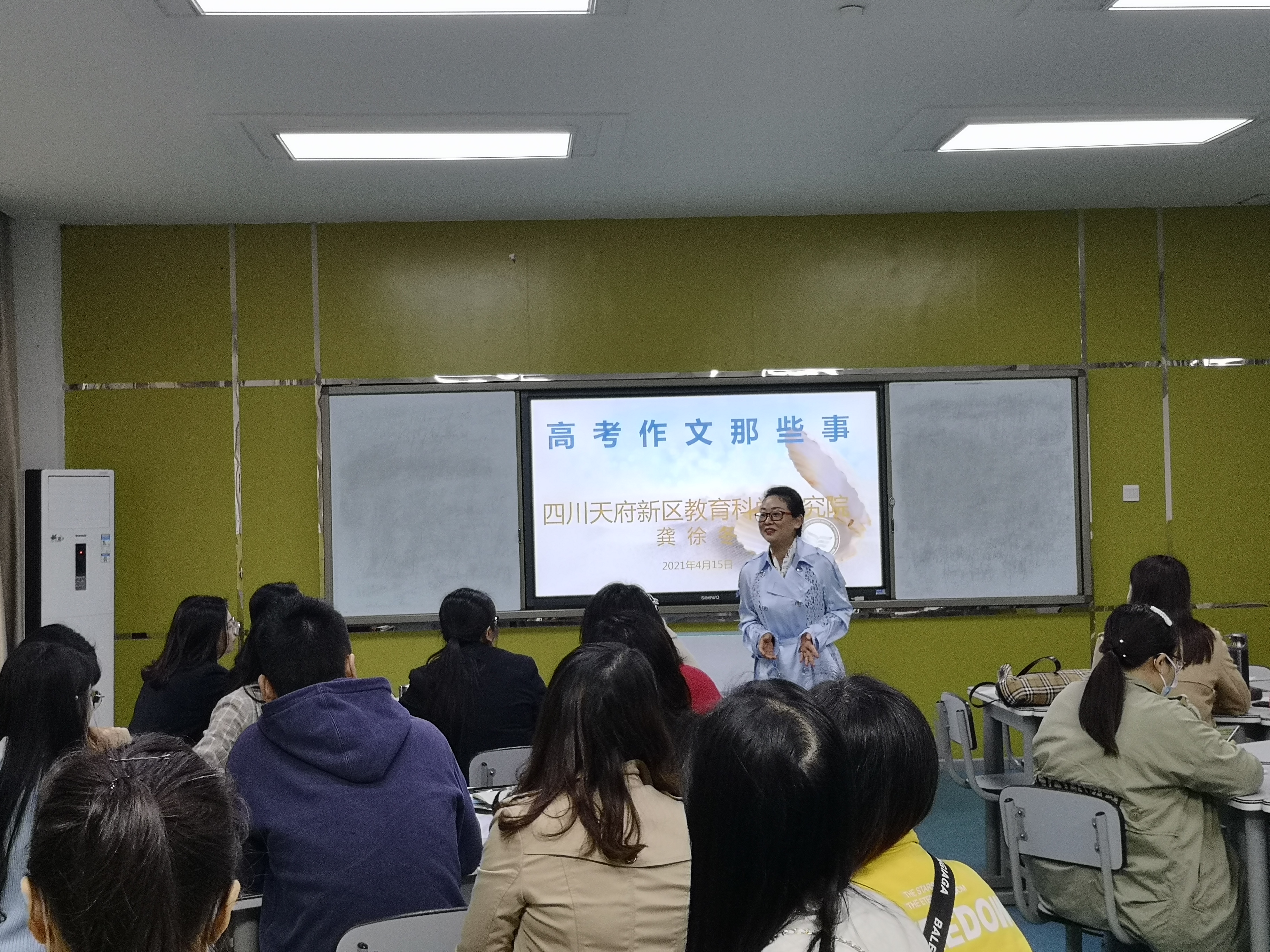 本次专题培训的主讲人是天府新区普通高中语文教研员龚徐冬老师,她为参会教师作了《高考作文那些事》对口升学作文专题讲座。