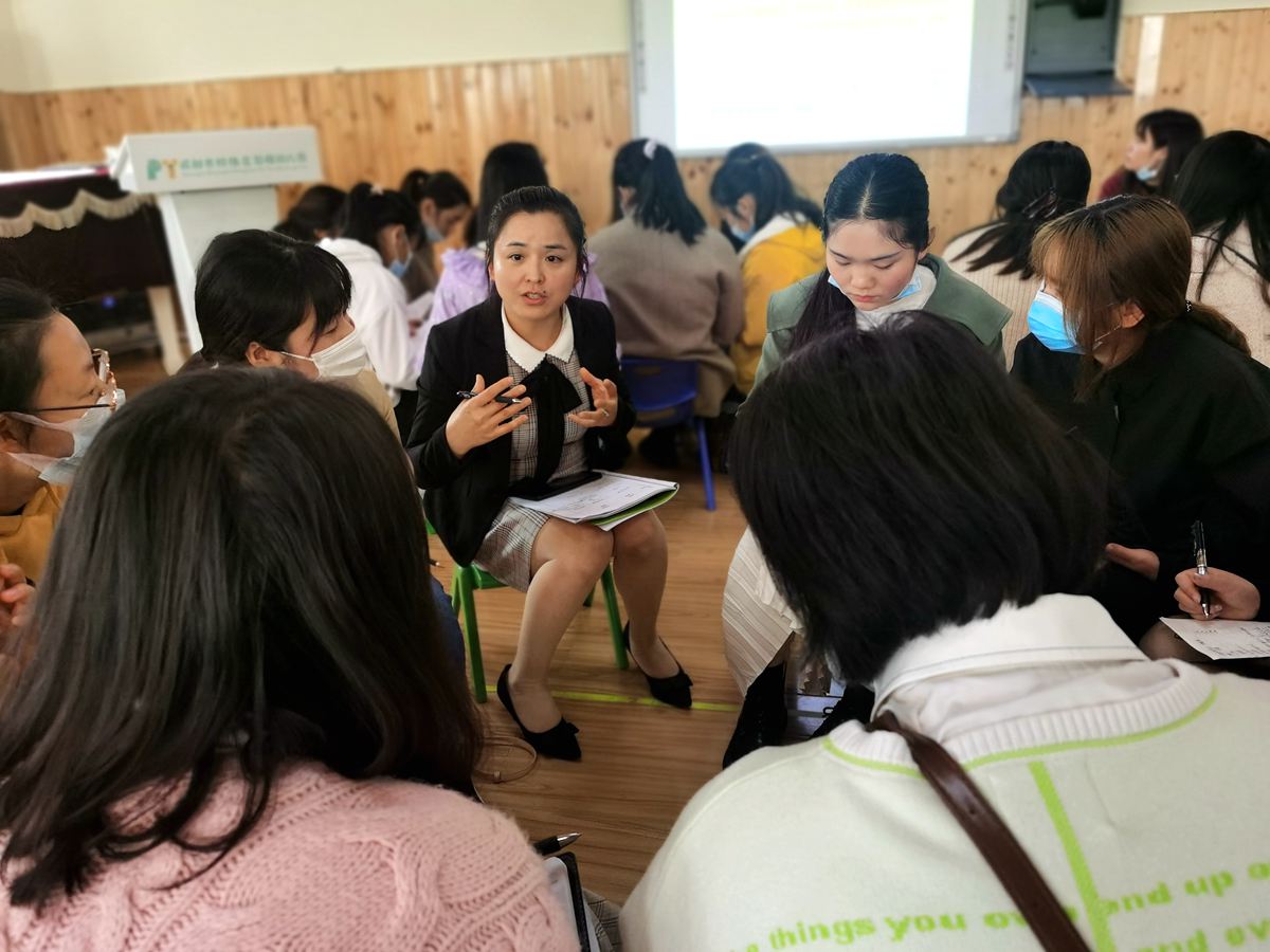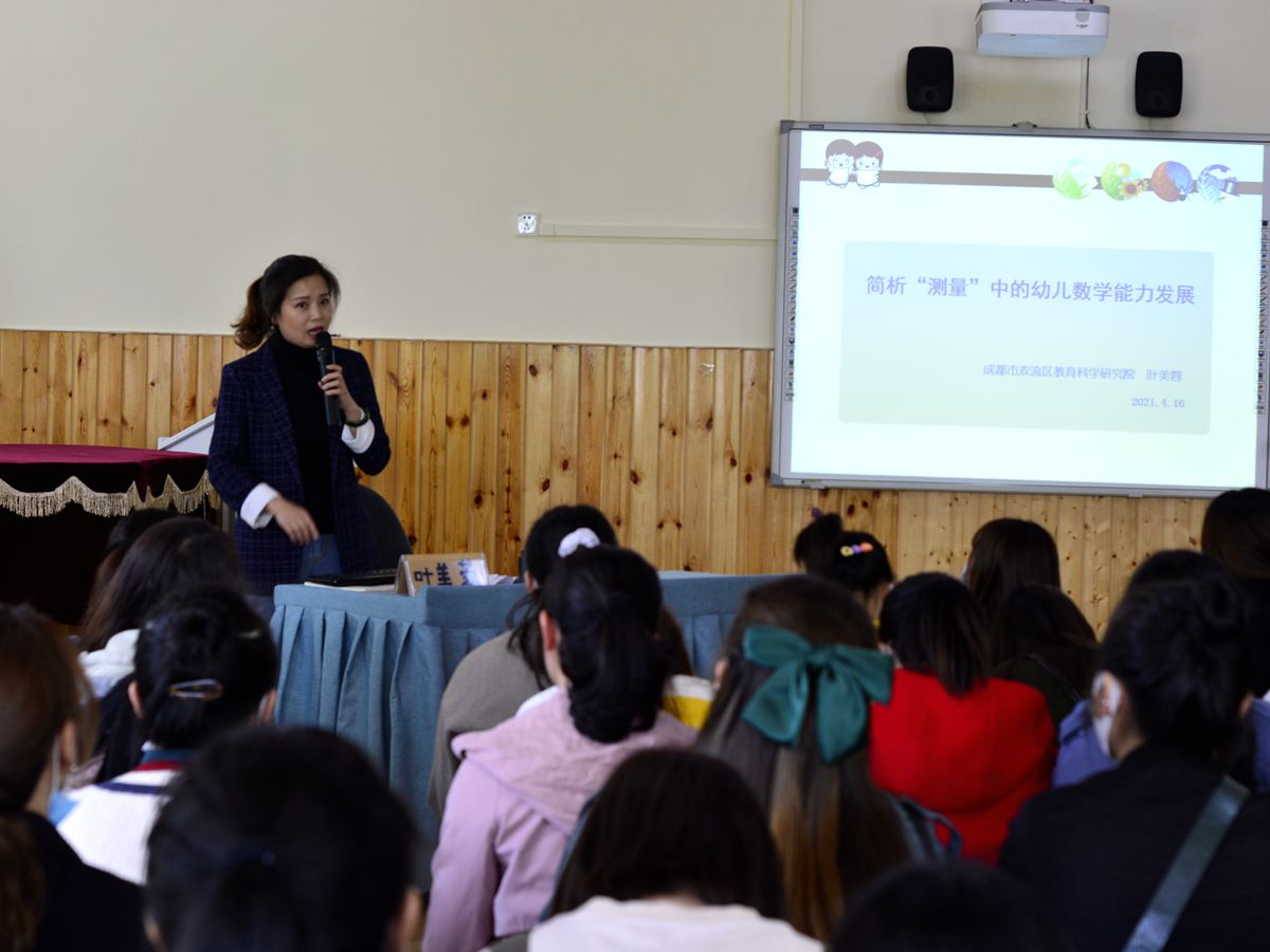 学前教育会场围绕主题“幼儿数学思维培养”开展活动。首先是课堂教学展示。彭镇幼儿园教师印晓艳和双流区学科带头人、西航港幼儿园教师汪璐分别执教了大班数学展示课《森林家具店》和《看谁跳得远》。接着在双流区教科院研培员曾云莉主持下进行了评课议课。最后成都市特级教师、双流教科院研培员、双流区名教师工作室导师叶美蓉作了题为《简析“测量”中的幼儿数学能力发展》的专题报告。参会教师就自己在教育教学工作中的困惑同送教的专家进行了积极地互动交流。