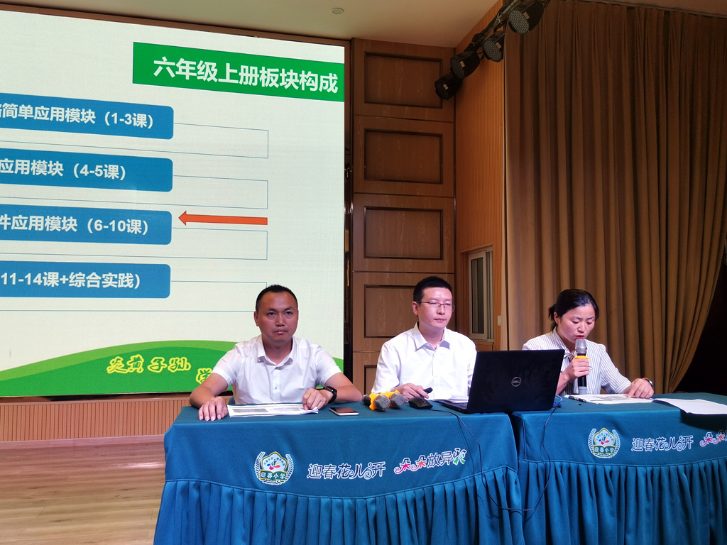 本次大赛将《信息技术》三-六年级(上册)教材拆分为12个单元任务包,通过提前抽签决定顺序及内容的方式分别由实验小学、黄龙溪学校、胜利小学等12所学校教师作现场解读并对评委提出的问题进行现场答疑。按活动规则,除了担任本次大赛的罗涛、熊丽、王鹏三位评委现场打分外,在场的每位参会教师还以学校为单位作为大众评委参与到对解读学校的打分中。