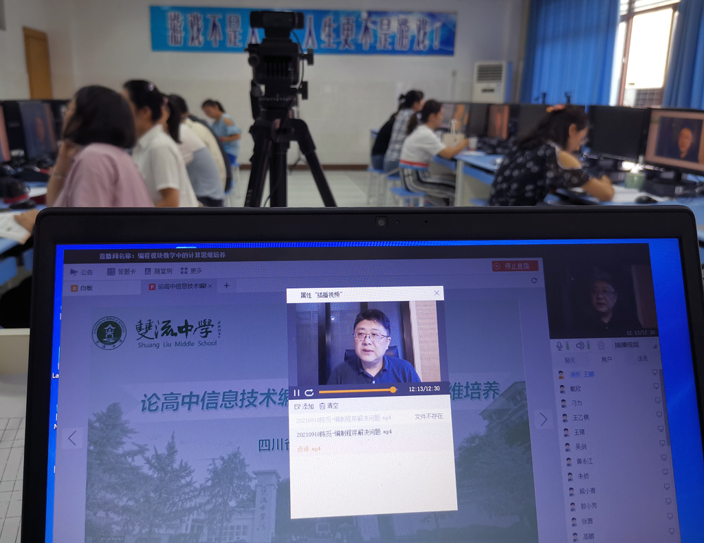 2021年9月24日,由双流区教育科学研究院牵头申报的成都市高中信息技术课程菜单系列培训活动在双流中学举行。本次培训活动围绕“编程模块教学中的计算思维培养”主题,采取线上线下结合,区内教师现场参与线下培训,成都市其他学校教师通过中小学继续教育网的直播平台参与线上培训方式进行。