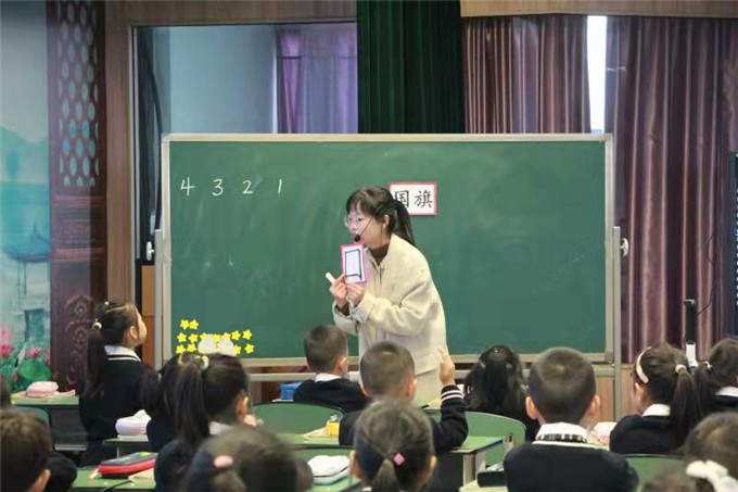 董斯老师在执教《升国旗》一课时,从课题入手,引导学生学会加一加,换一换的识字方法。让孩子在一遍遍朗读中理解升国旗是一种庄重的仪式,激发热爱祖国的思想感情。