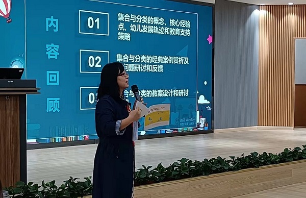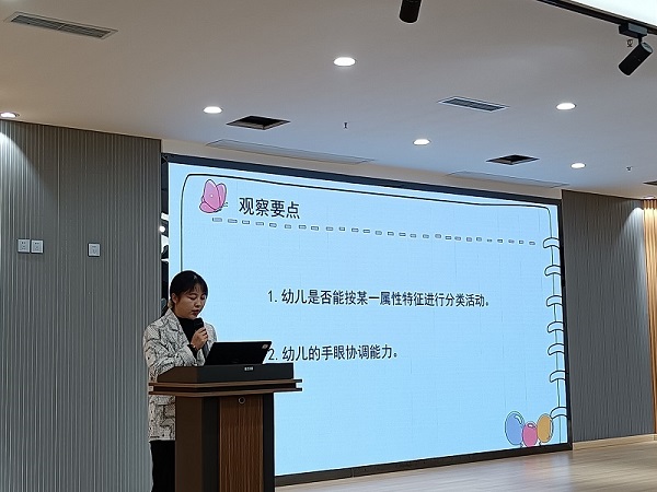 课例展示后,西航港星月幼儿园教师余静,分享了小班数学《集合与分类》个别化学习操作材料。她从材料介绍、玩法、观察要点,幼儿操作材料视频分析这四个方面向大家呈现了小班幼儿对《集合与分类》在游戏区角里的一个学习特点。