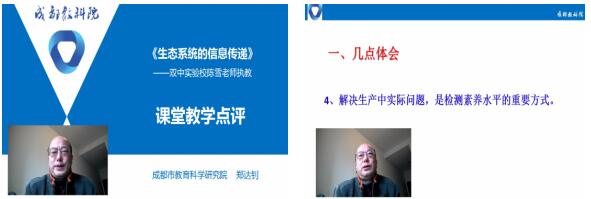 本次教研会第二环节是由成都市教科院教研员郑达钊老师进行点评,郑老师对陈雪老师的这节课给予了高度的评价,认为是一堂符合课改理念的好课。对双中实验校学习任务单的设计和使用予以充分的肯定和赞扬。整个课堂体现了大概念下的教学评一致性的教学理念。主要有以下特点:1.基于前置学习的课堂教学(预习任务),有利于学生进行深度学习。2.以学生学习为主线设计的学习任务单明确了问题,利于学生知识的过关落实,便于学生形成学习档案。3.由事实抽象形成概念的过程,有利于培养学生分析、归纳、概括、推理等能力。4.让学生用所学知识解决生产中实际问题,是检测学生的素养水平的重要方式。5.用丰富的教学内容发展了学生的生命观念并培养了社会责任意识。当然郑老师也对本堂课提出了一些需要强化和完善的地方。