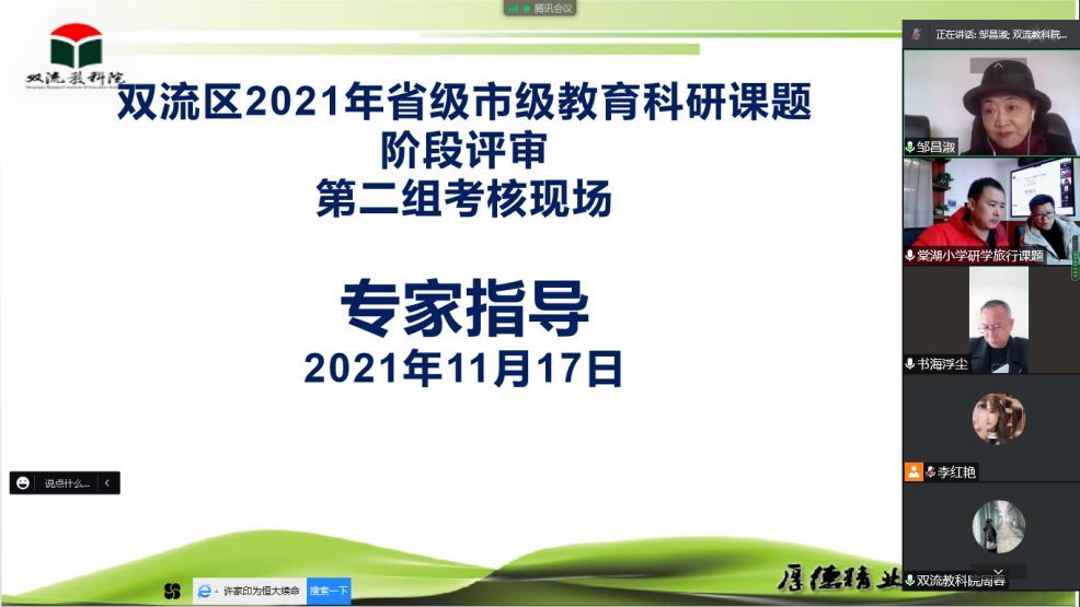 为切实了解双流区在研省级、市级课题研究现状,提升课题阶段成果提炼水平,推动课题研究有效开展,按照成都市2021年市级课题考核评审相关文件要求,2021年11月17日,双流区教育科学规划办组织了双流区2021年省级、市级科研课题年度考核评审工作。由于疫情影响,本次考核工作转为线上举行,使用腾讯会议开展。本次考核评审聘请了来自省市区的教育科研专家担任考核评委,承担了2018-2020年在研省级市级课题的学校校长、教科室主任、主研教师、研培员等100余人参加了评审指导活动.