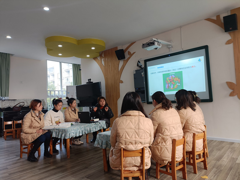 首先,汪璐老师协同西航港幼儿园教师团队围绕“集合与分类数学核心经验”,通过参与、互动式理论学习的方式开展现场教研活动。在教研过程中,汪老师以问题情境为切入点,引导教师积极思考、交流,始终把教师作为教研主体,不断引导教师探讨自己对核心经验的理解和认识,并通过教学活动中的常用材料激发教师讨论。在教研的过程中清晰的给大家解读了“集合与分类”的概念、核心经验及幼儿发展轨迹,整个现场教研活动研讨氛围浓厚。