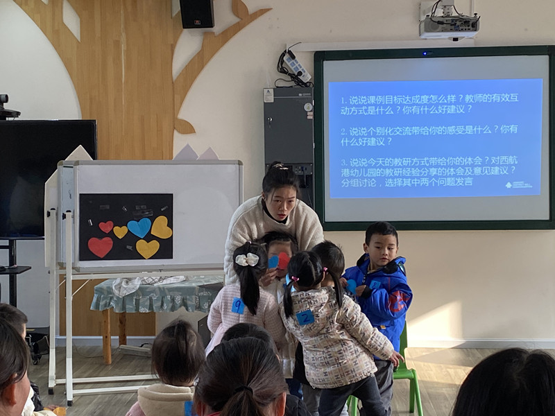 接着,谢蕾老师给大家带来了“集合与分类”的集教活动《爱心宝宝》,在活动中谢老师根据小班孩子年龄特点,创设丰富、有趣的情景,结合幼儿的生活经验运用“找朋友”的游戏,根据“爱心宝宝”的外部特征进行分类游戏,在活动中教师关注孩子的表现,及时给与回应,而孩子在活动积极参与、表达。教研组老师围绕幼儿的学习品质、学习能力等对本次活动中进行了评价、交流。在整个教研互动过程中汪老师始终把教师作为教研主体,引导教师开展理论学习、现场研讨、课后反思、总结经验。