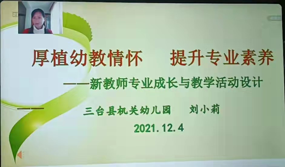 三台县机关幼儿园党支部书记、园长,三台县专家型教师,绵阳市优秀教师,四川省骨干教师刘小莉为学前教育段新教师们带来了《业精于勤行成于思——做新时代有情怀的幼教人》(幼儿专业成长与活动设计)的专题讲座。首先,刘老师让老师们清楚认识了教师的角色定位。接着,刘老师从幼儿园教学(集教)活动设计方面来讨论教师在集体教学活动上的设计要素,希望大家作为幼儿教师能知行合一,脚踏实地。