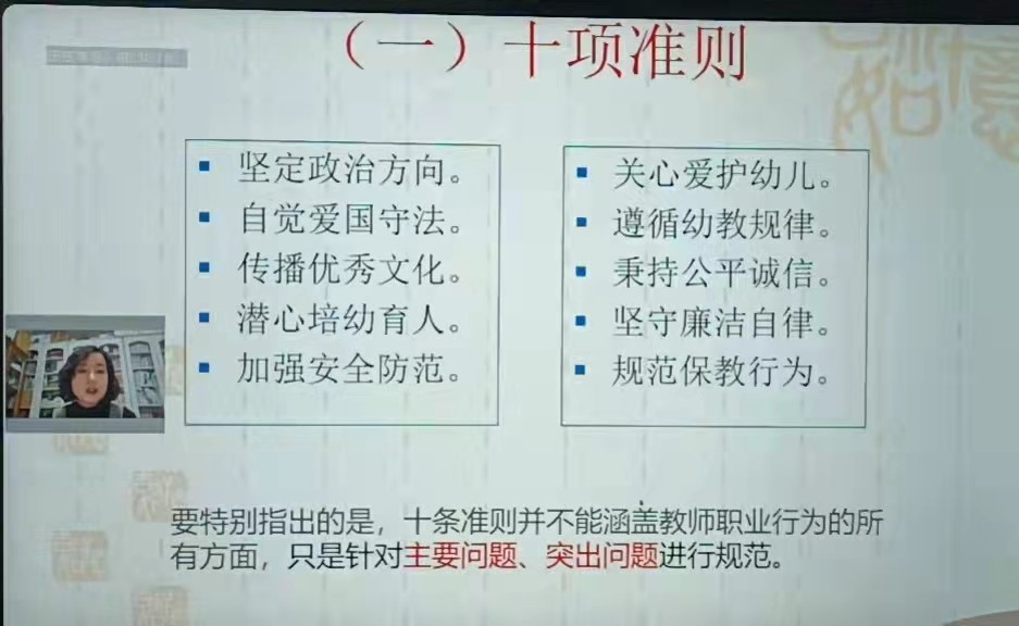 四川师范大学教育科学学院副教授、硕士生导师张紫照为学前教育段新教师作《新时代幼儿园教师职业行为十项准则》解读。在解析每条准则时,张老师采用大量的案例为大家那些解说,让老师们警醒,在平常的教育教学、师德师风建设中一定要牢记十项准则,做到:坚定政治方向、自觉爱国守法、传播优秀文化、潜心培幼育人、加强安全防范、关心爱护幼儿、遵循幼教规律、秉持公平诚信、坚守廉洁自律、规范保教行为。告诫大家要以十项准则来约束、规范自己,重视师德师风建设,争做新时代具有崇高师德的幼儿教师。