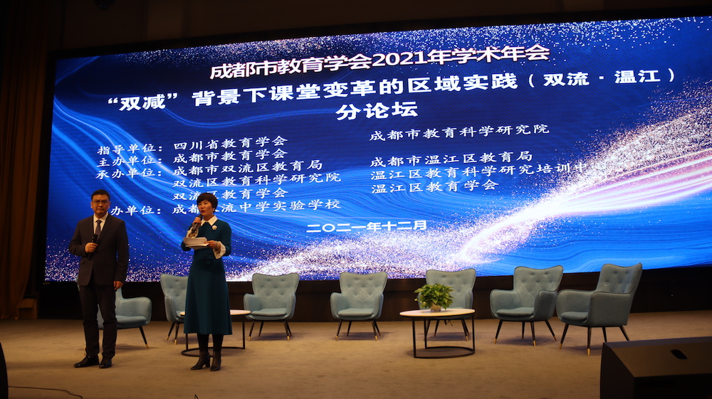 2021年12月24日下午14:00,成都市教育学会2021年学术年会双流·温江分论坛活动在成都双流中学实验学校顺利举行。分论坛的主题为“双减”背景下课堂变革的区域实践。本次分论坛由双流区和温江区教育局、教研部门、教育学会共同承办,由成都双流中学实验学校协办。成都市教育学会会长王志坚,成都市教育学会副秘书长陈军,成都师范学院初等教育系主任、四川教育研究会教师发展专委会副理事长、四川省陶行知研究会教师发展专委会秘书长徐猛副教授,双流区教育学会会长高志文,温江区教育科学研究培训中心主任王毓舜,双流区教科院副院长、双流区教育学会常务副会长赵剑云及来自成都市各区县的会员代表96人参加了现场会议。成都六合纵横公司对分论坛活动进行了现场直播。双流区教科院教育改革研究中心主任、双流区教育学会秘书长易恩,温江区教育科学研究培训中心教育科学研究室主任张光伟主持分论坛活动。