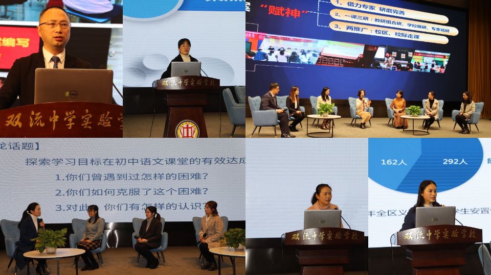 教研探索环节,双流区教科院初中语文教研员李艾璘做了题为《探索学习目标在初中语文课堂的有效达成》的分享,并与三位青年语文教师从基于课标、借助教材、倾注课堂、聚焦学生进行了现场沙龙研讨,分享了区域语文学科推进教学评一致的经验和学校经验。特殊教育教研员彭文平以题为《学为中心—构建生命课堂》进行了交流,彭老师从以学定标基于课程开展区域教研、以学定教目标导向实施弹性教学、以学研评个性化支持提高学习效能三个方面介绍了双流融合教育实施教学评一致的区域举措。