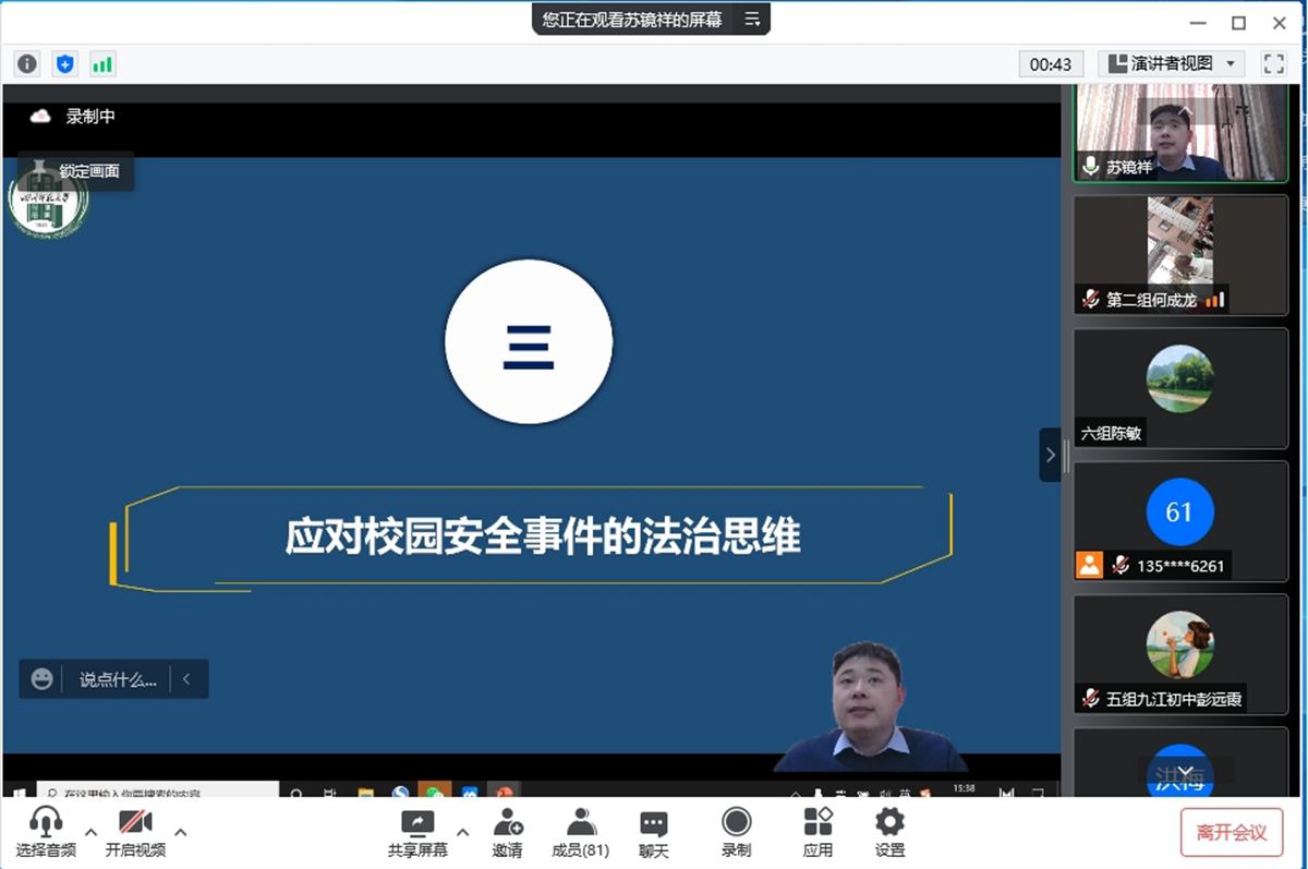苏老师结合大数据分析还有许多实例,清晰地给我们指出了校园安全事件的应对办法和基本思维,给我们一线的班主任们给出了具体有效的处理办法。“及时救助”“及时告知”“及时报告”“法治思维”等词语在深深的烙在老师们心中,也给老师们在今后的工作中给以安全重要的警醒。