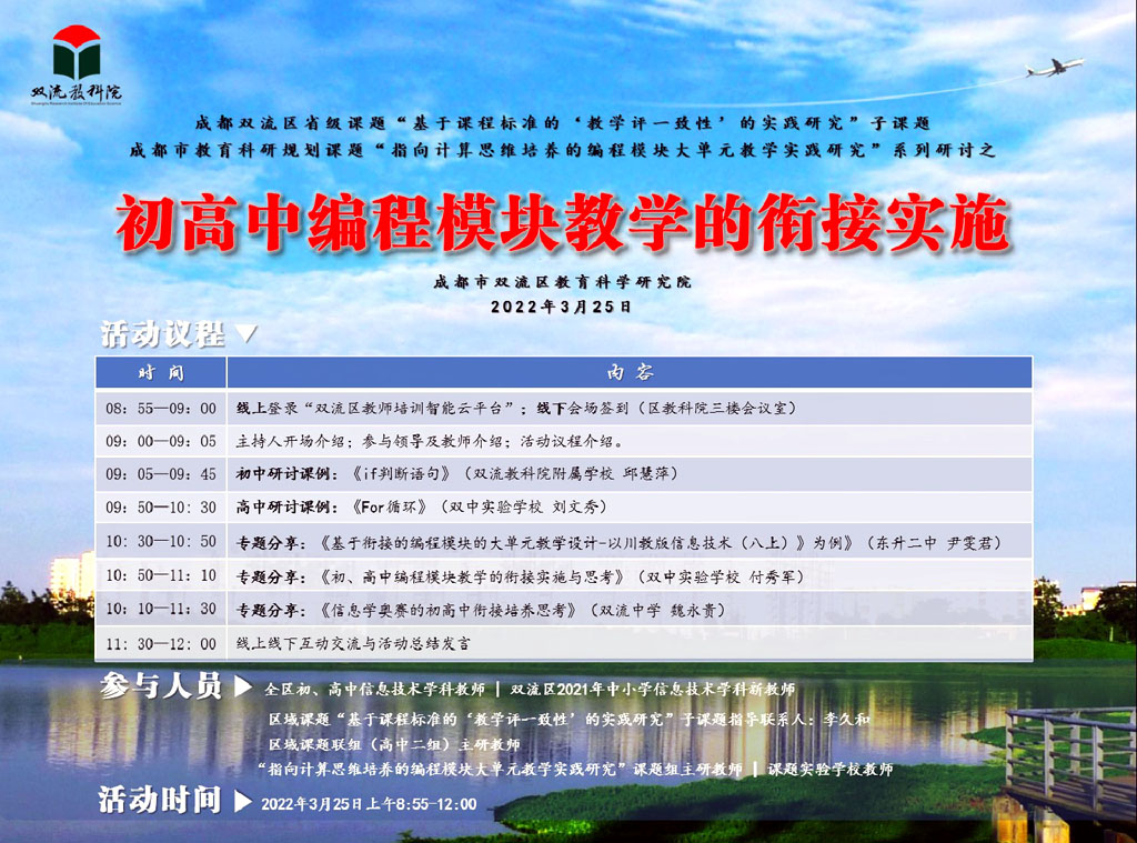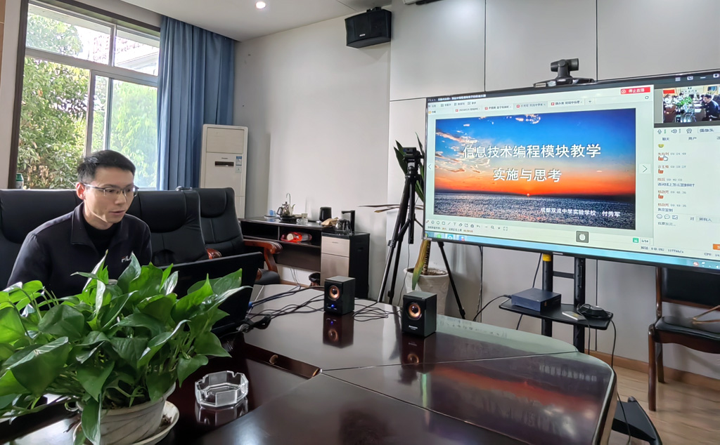 2022年3月25日上午,聚焦“初高中编程模块教学的衔接实施”主题,由成都市双流区教育科学研究院组织实施的“指向计算思维培养的编程模块大单元教学实践研究”课题研讨活动暨区域课题联组(高中二组)研修活动顺利举行;本次活动采用线上线下结合方式,区域课题联组指导联系人、双流区教科院李久和书记以及课题组部分主研教师、主讲教师全程参与了在区教科院三楼会议室的现场活动,来自全区的初高中信息技术学科教师、课题实验学校教师、区域课题联组(高中二组)主研教师则通过师培通云平台进行了线上观摩。
