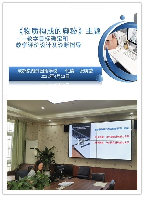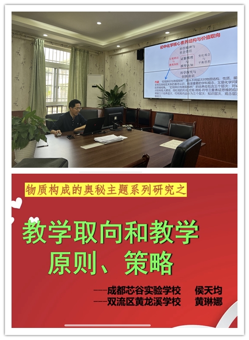 接下来是由芯谷实验学校侯天均老师和黄龙溪学校黄琳娜老师准备的《物质构成的奥秘》主题——教学取向和教学原则、策略,侯老师利用教学案例向老师们展示了教学取向和教学原则、策略的细节。