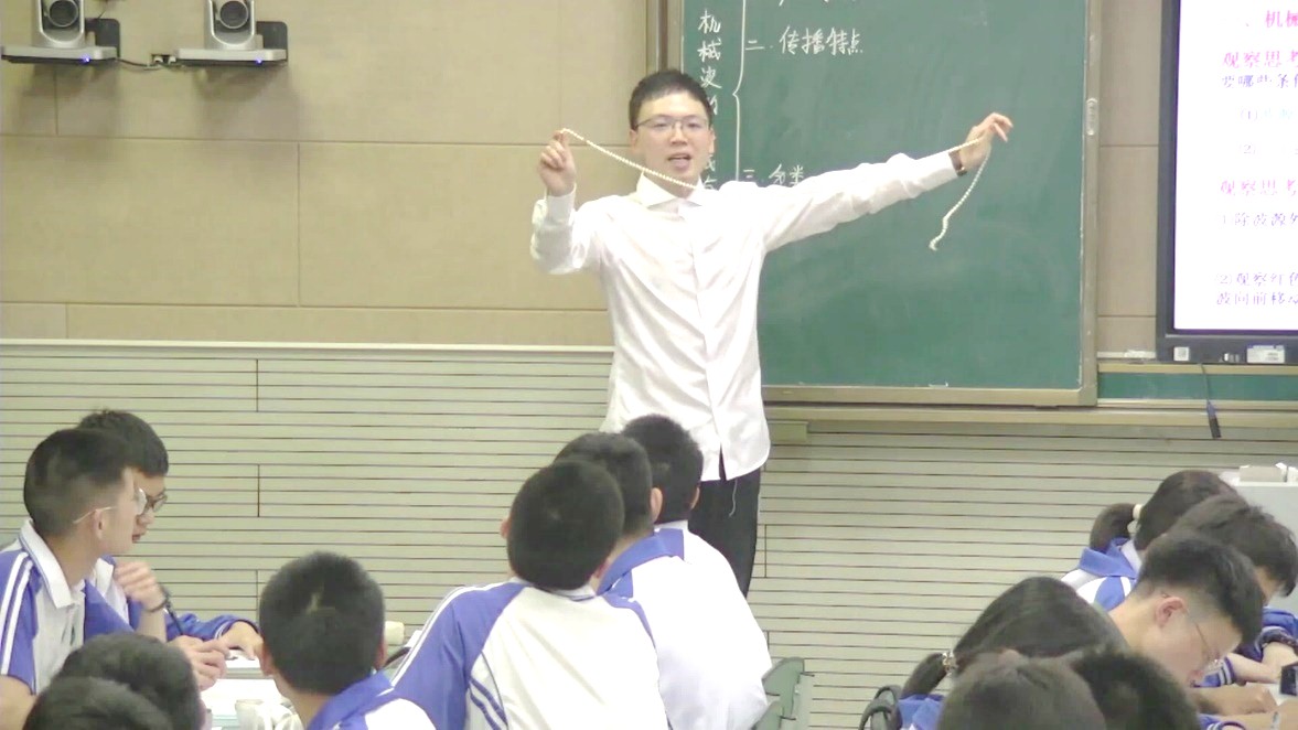 随后,课题组成员龚先彬老师对课例进行了全方位多角度地点评。龚老师认为本堂示范课具有“准备充分、活动丰富、逻辑清晰、评价精准、效果明显”的特点。课堂目标的设计源于对课程标准的精准把握,绳波演示、珍珠串实验、机械波演示仪等丰富多彩的课堂活动设计,极大地调动了学生学习的积极性,活跃了课堂的学习氛围,展现了物理学的规律方法。