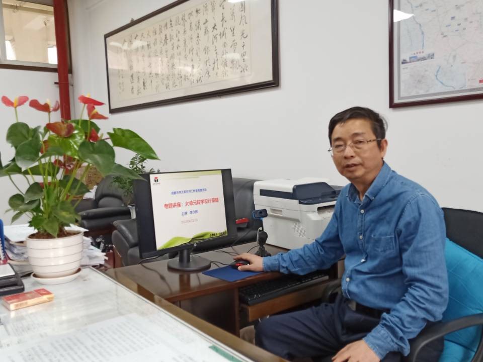 本次活动的第三个环节由四川省特级教师、名师工作室领衔人李久和老师作了题为《大单元教学设计策略》的专题报告。李老师主要从什么是大单元教学设计、为何要开展大单元教学设计、怎样进行大单元教学设计、学科教学教师要实现四个转变、大单元教学设计思路五个方面进行专题讲座。李老师指出,所谓大单元教学设计是指围绕一个“大观念”、“大任务”,对单元整体知识结构,科学方法结构,学生认知特点和规律进行分析,依据课程标准,聚焦学生学科核心素养,设计学习目标、评价任务、学习活动。开展大单元设计是推进国家课程校本化的必然选择、是落实学科核心素养的必然选择、是促进教师专业水平提升的必然选择。