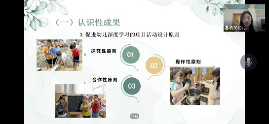首先,是由工作室学员、机关幼儿园科研室主任杨晓利带来的《促进幼儿深度学习的项目活动研究》,杨晓利主任从研究的来源、操作的方法、呈现的方式、成果的梳理四个层面进行了讲解,让我们对课题有了独特认识和理解,其中杨晓利主任讲到的三三四模式中的三角度、三阶段、四要素,具有重要的参考价值,值得我们借鉴学习。