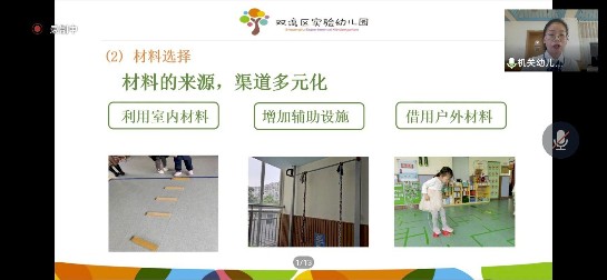 接着,由实验幼儿园高星老师带来了《基于儿童视角的幼儿园室内区域体育游戏设计与实施研究》阶段性成果汇报,高星老师从观念到实践进行了讲解,从认识性成果、操作性成果、物化成果、研究效果四个方面进行了讲解,从儿童本位出发,利用马赛克方法归纳出幼儿园室内区域体育游戏材料选择的特征及马赛克方法运用到各年龄段的策略。