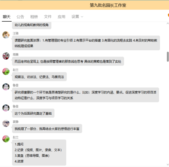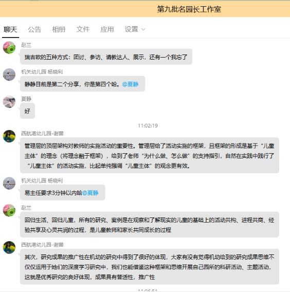 最后,全体工作室成员利用线上分享了本次活动的收获与感想,分别从管理者和一线教师两个层面进行了分享交流,充分肯定了管理层的顶层架构对教师的实施活动的重要性,我们要基于儿童主体的理念,回归生活、回归儿童。工作室导师叶美蓉和各专家总结到:管理要有高度、研究要有深度、成果要有厚度,管理是科研推进的坚强后盾,实践是成果形成的重要路径,我们要用科研的视角剖析教育的价值,尊重幼儿的主体地位。