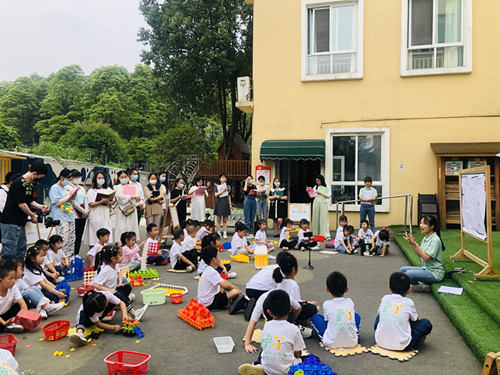 首先,学员们分别观摩了彭镇幼儿园大班“我喜欢的建筑”和“我的幼儿园”两个 “主题建构”现场活动。