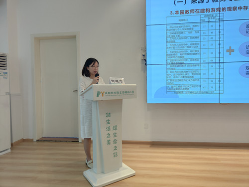 其次,由工作室学员何滟溶带来《从“看到”到“看见”》专题讲座,何园长以自己所在幼儿园建构游戏的开展为例,深入的给大家讲解了园所建构游戏研究的来源,园所在开展建构游戏教研的具体做法和成效。接着,实验第一幼儿园张静老师带来“幼儿园中班主题建构活动”案例分享,张老师具体介绍了班级建构游戏的背景、幼儿具体情况及开展建构游戏的过程。用四个鲜活的观察案例来诠释了教师在建构游戏开展过程中的观察、反思以及调整,看到了教师在建构游戏中对孩子的观察和对材料的调整,以及孩子在建构游戏中的变化。