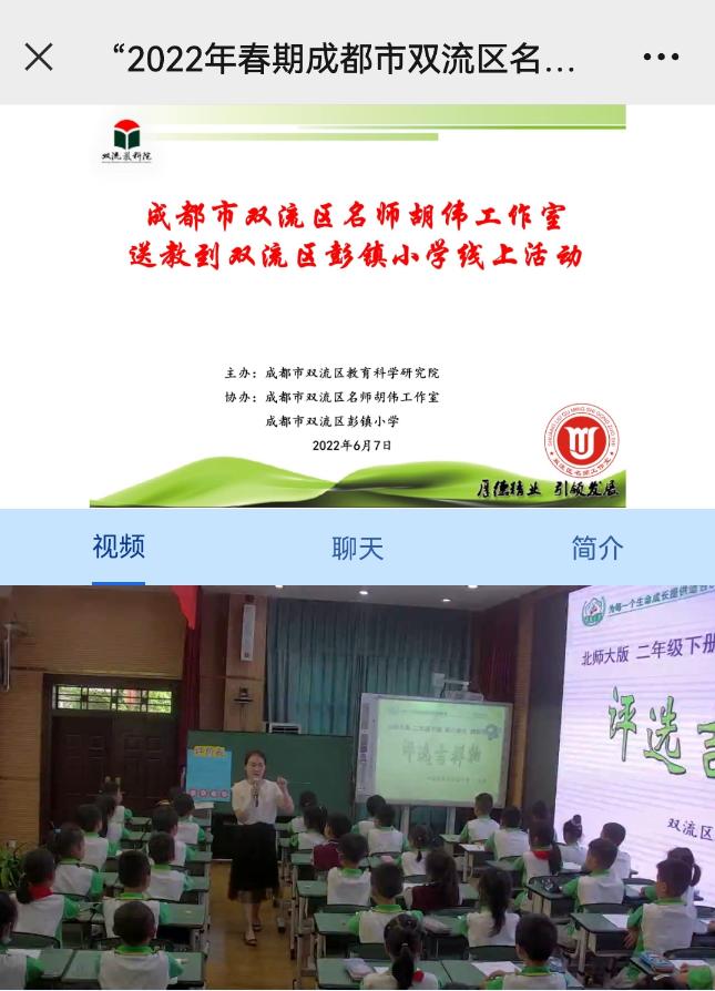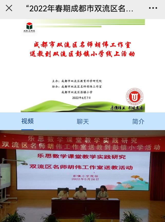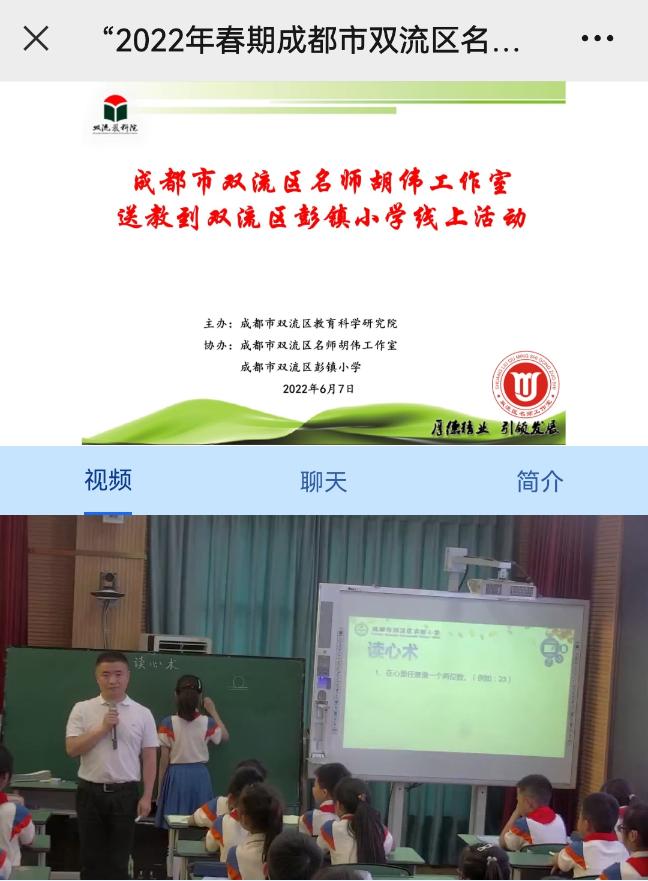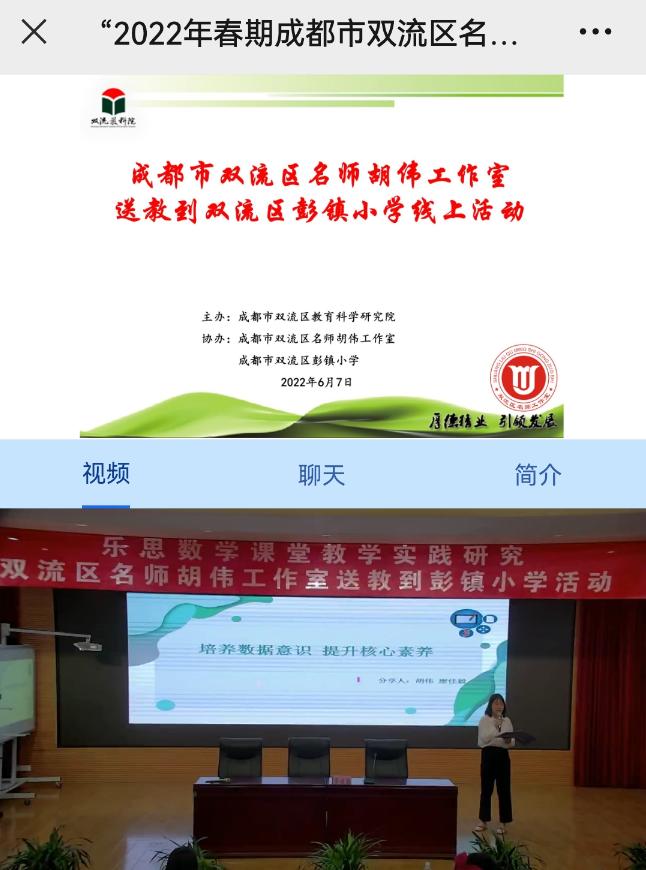 2022年6月7日上午,“2022年春期成都市双流区名师胡伟工作室送教到双流区彭镇小学”线上活动在“师培通”云平台上顺利开展。本次活动由成都市双流区教育科学研究院主办,双流区名师胡伟工作室、双流区彭镇小学承办。活动主题为“聚焦数学核心素养 乐研善思促成长”。双流区内、区外小学数学教师线上线下参与活动共计近700人。