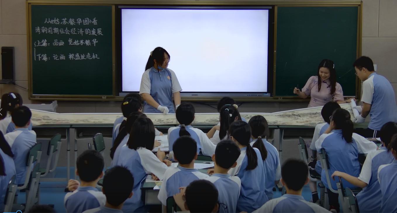 立格实验学校胡敏霞老师以《见微知著 画卷里寻盛世繁华——清朝前期社会经济的发展》为题进行课例展示。胡老师从学情出发,在史料选取上选择了具象的材料,深度开发教材资源,精选了清代写实性风俗画《姑苏繁华图》,以图像史料为主线,多元史料相互印证,根据画卷场景创设情境,并尝试循序渐进地进行批判性思维训练。