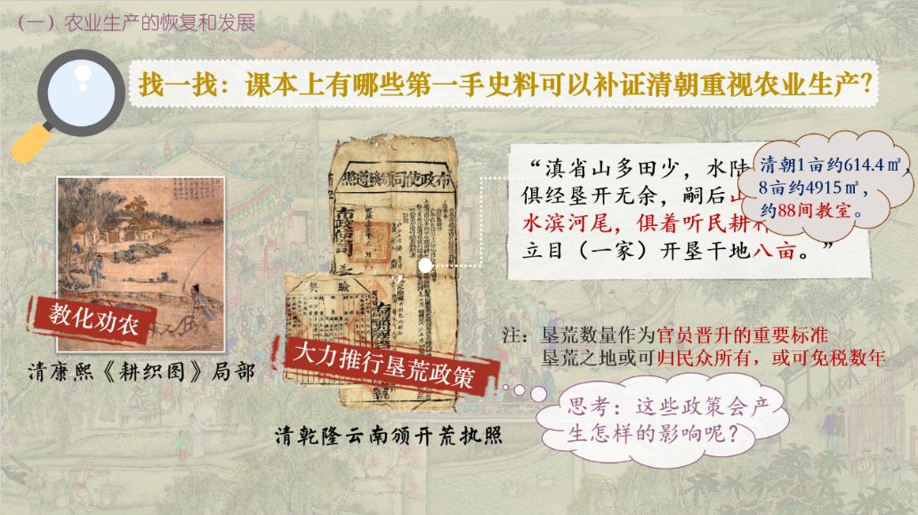 上篇“品画:览姑苏繁华”,通过深入挖掘画卷信息,以多元史料为依托,创设历史情境,激发学生学习兴趣。在有趣的师生互动、生生互动中了解农业、手工业和商业的进步和人口增长史实,感知清朝前期社会经济的发展。