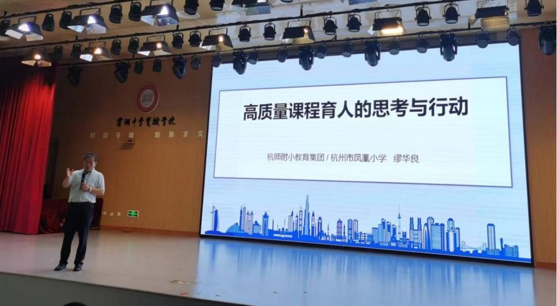 上午9:00,杭师附小教育集团理事长、杭州市凤凰小学校长、语文特级教师缪华良老师作《高质量课程育人的思考与行动》专题讲座。缪校长基于简史视角展开对课程育人的价值思考,并通过“无分成绩单”、“任性五分钟”、“鼓励搞事情——作业即作品”三个故事与大家分享了凤凰小学的课程育人简史。缪校长提出,校(园)长应树立正确的课程观,学习“双新”,把握课程育人的要义。最后,他以“梧桐树”课程为例,分享了课程体系的设计路径,倡议大家变革教学方法,以“梧桐云”数字平台为例介绍了新时代的教育评价体系。