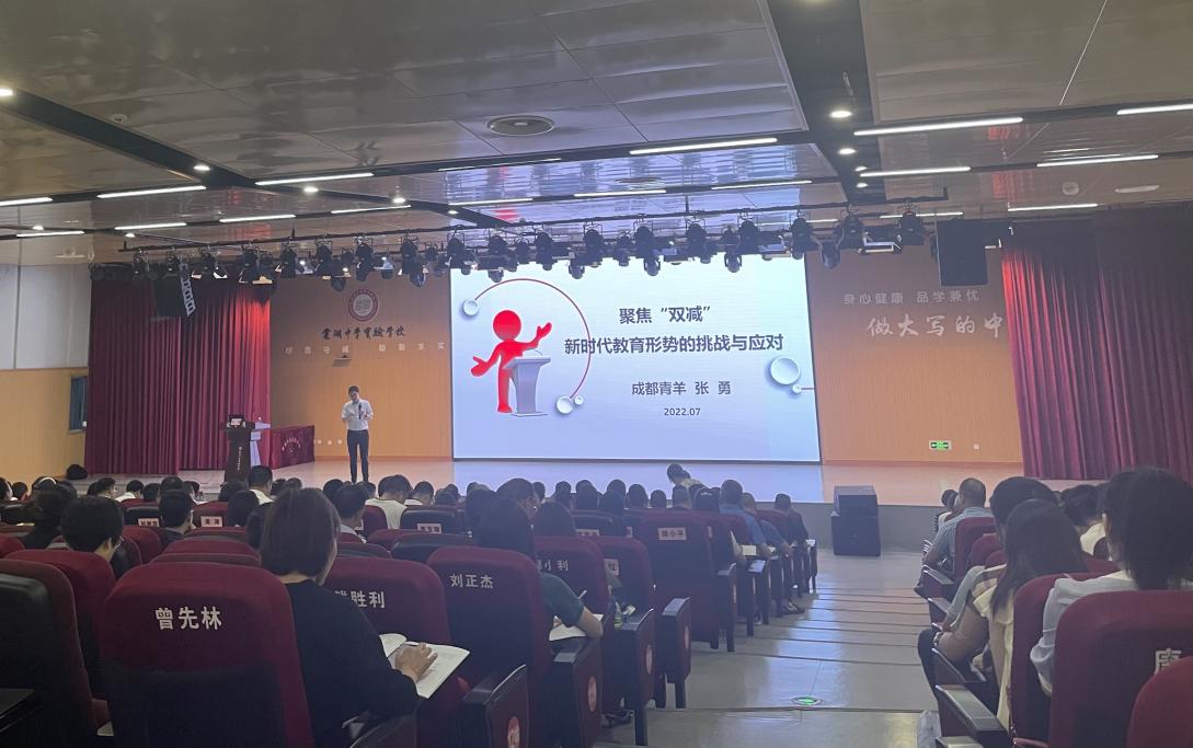 下午的培训从13:30开始,中国教育科学研究院访问学者、四川省教育督导评估专家、高级教师张勇老师作《聚焦“双减” 新时代教育形势的挑战与应对》专题讲座。张老师从国家政策出发,深度剖析了国家对“双减”的政治定位,讲解了校外培训的问题与弊端,“双减”如何重拳出击,治理乱象,减负提质。张老师提出,我们应该基于“双减”做理性的教育、优化学校内部治理、追求理想的课堂、锻造高效的教师队伍、丰富课后服务、密切家校合作,从而实现学校可持续健康发展。