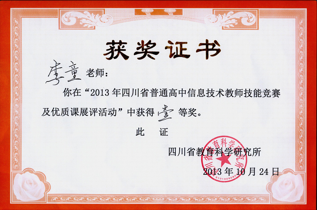 李童在2013四川省普通高中技术课程教师技能竞赛及优质课展评活动中获一等奖