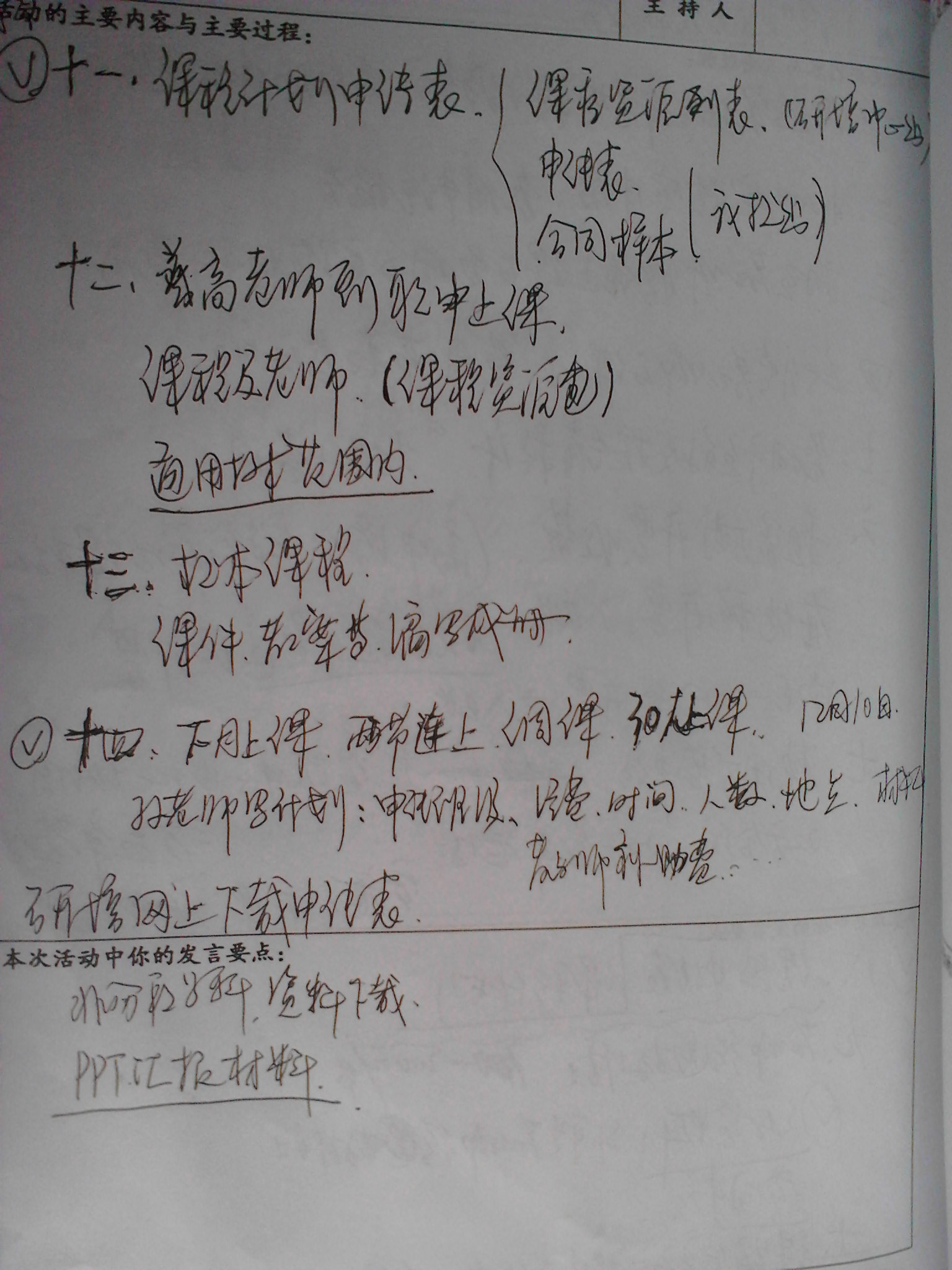 2013年11月7日下午3点,《双流县域内通用技术课程资源有效共享研究》课题组在双流中学信息技术中心讨论了课题年度考核的相关事务。如:课题实施、年度考核、经费、机器人工作室建设等。具体商讨了机器人实验室申报、费用申请报告;相互教师上课的费用及实施材料费用;所聘请教师的课时、节数等安排;费用预算及报销程序;租赁方式开票、收费;实施、开票、账务处理。着重提到了课程计划申请表的制作;校本课程的编写与制作;示范课的相关事宜等。