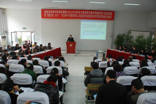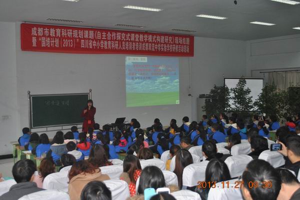 2013年11月27日上午,双流中学实验学校承担的成都市教育科研规划课题《自主合作探究式课堂教学模式构建研究》现场结题暨“国培计划(2013)”四川省中小学教育科研人员培训者培训研修活动在成都双流中学实验学校隆重举行。来自全省各地的科研骨干360余人参加了本次活动,四川省教科所吉文昌所长,四川省教科所科研管理室王真东主任、青春主任,成都大学周小山教授、四川师大教师培训学院副院长曹正善教授、成都市教科院教育改革发展研究所胡燕所长、双流县研培中心理论室易恩主任等领导和专家莅临现场指导工作。双流中学实验学校副校长张润林、王伟等领导和课题组主研教师参加现场结题会。