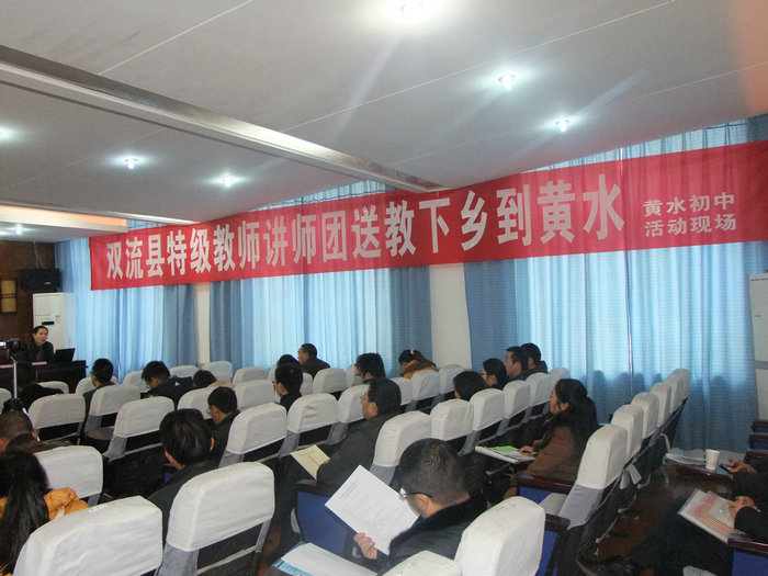2013年12月13日,黄水初中举办了“双流县特级教师讲师团送教下乡到黄水”活动。活动主题为:“构建高效课堂,促进专业发展”之聚焦“创设情境,激发兴趣”。参加此次活动的人员有:以省特级教师高志文为团长的特级教师讲师团,以县研培中心主任邱刚田为主的市学科带头人分队,以县人才交流中心教育分中心为主的省市县名优教师分队,新双流各初级中学的英语、数学、物理学科教师代表,黄水初中相关学科教师,共计80余人。活动由省特级教师高志文主持。
