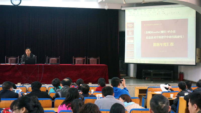 最后,双流县研培中心王鹏老师就在研课题《县域Moodle平台在信息技术学科教学中的实践研究》作了阶段研究成果展示与交流,并围绕县域课题开展方面的重点事项,对本学期的工作进行了安排部署。