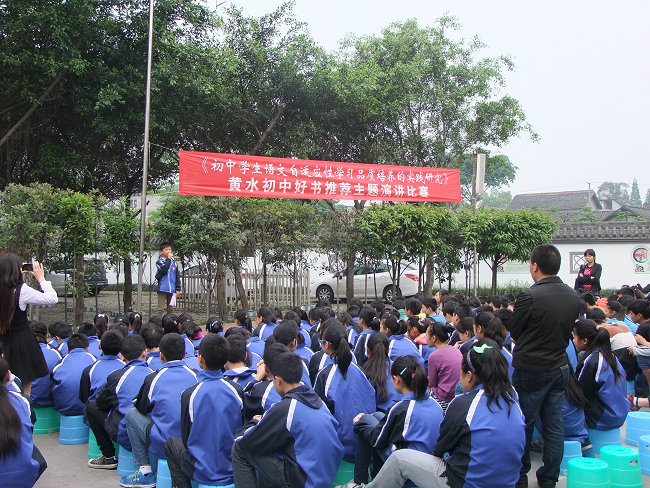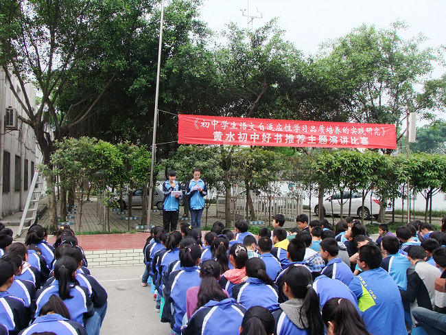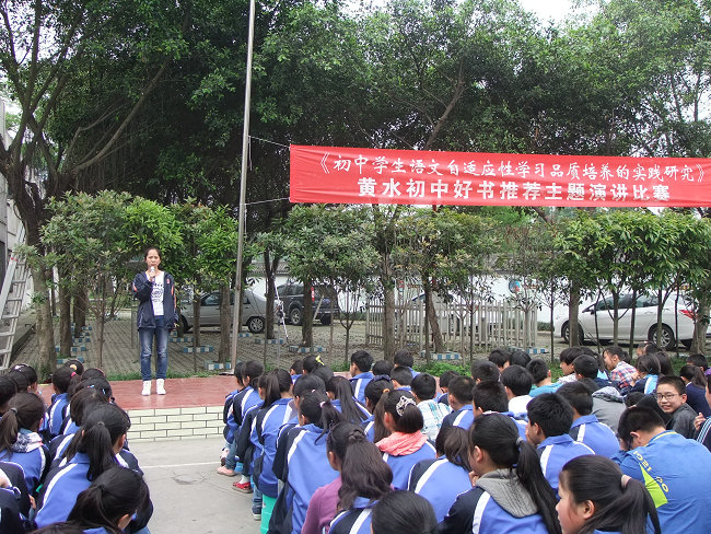 2014年4月23日“世界读书日”,黄水初中举行了“畅享阅读,弘扬经典”的好书推荐主题演讲比赛活动。全校700余名师生参加活动。活动由黄水初中《初中学生语文自适应性学习品质培养的实践研究》课题组主办。