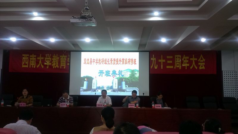 2014年7月4日,双流县中学理科教研组长高级研修班开班典礼在西南大学教育学部举行。西南大学教育学部教育学院胡琴副院长主持了开班典礼。西南大学教育学部部长助理、博士生导师彭泽平教授,双流县研培中心谢祖福副主任,以及县研培中心教师发展室赵剑云主任,职教室冯枝桃主任以及参加此次中学理科教研组长高级研修班学习的79名学员共同参加了开班典礼活动。