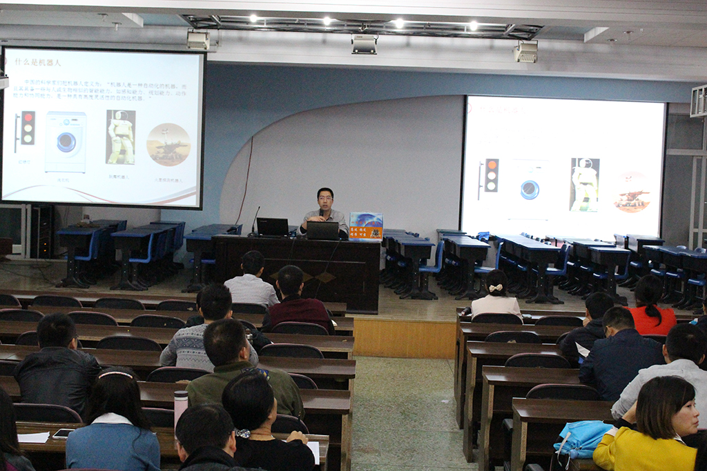 上午九点,活动正式开始。首先由双流县研培中心教研员熊斌老师为大家带来关于机器人教育的专题讲座“机器人创新教育”。熊老师首先从机器人基本概念、机器人教育的目的和意义、机器人教育的机遇和挑战、开展机器人教育的三个阶段对机器人教育进行了细致的阐述。为了使各位老师更直观深刻了解机器人,熊老师以“四能教育机器人”的项目为例,向我们说明了教育机器人的教育意义和在学校的应用。熊老师还分享了多年机器人教学经验,对参会老师提出了很多机器人教育方面的宝贵意见。