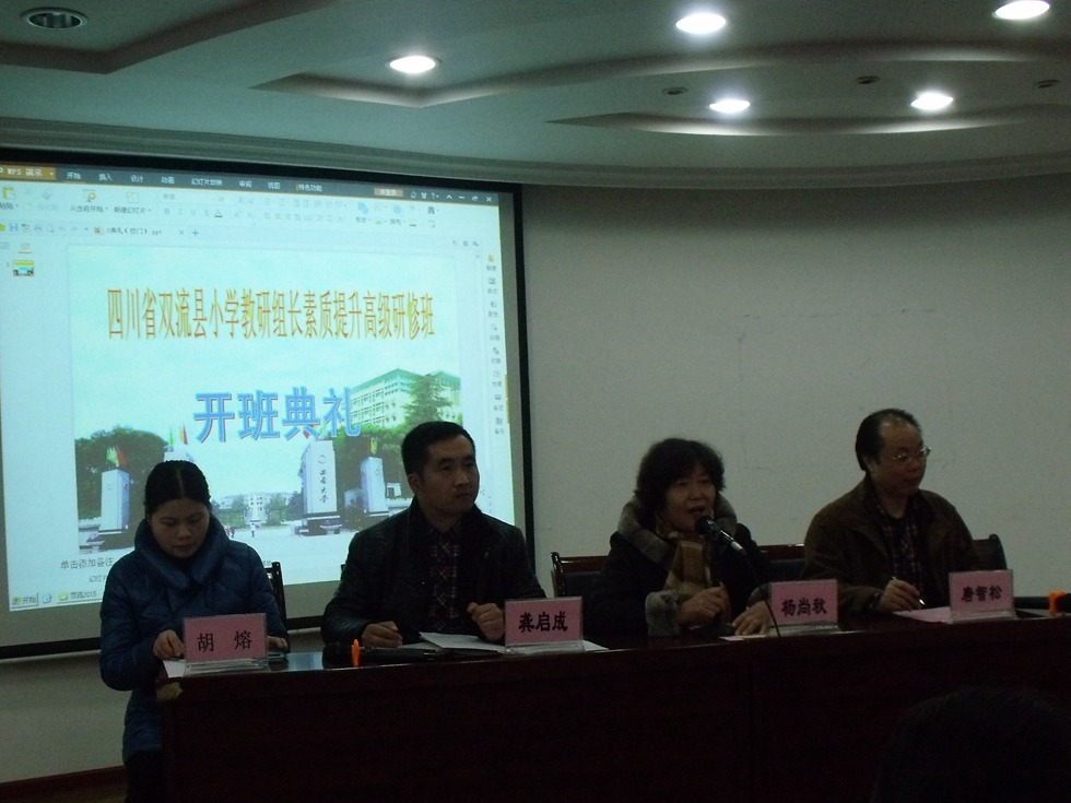 1月25日上午,2015年双流县小学教研组长素质提升高级研修班开班典礼和第一天的培训活动在西南大学教育学部隆重举行。西南大学教育学部党委书记杨尚秋教授,双流县研培中心质量监测室副主任龚启成出席了开班典礼。双流县研培中心小学室学科研培员和2015年双流县小学教研组长素质提升高级研修班全体学员参加了开班典礼并认真参加了培训活动。典礼由西南大学唐智松教授主持。