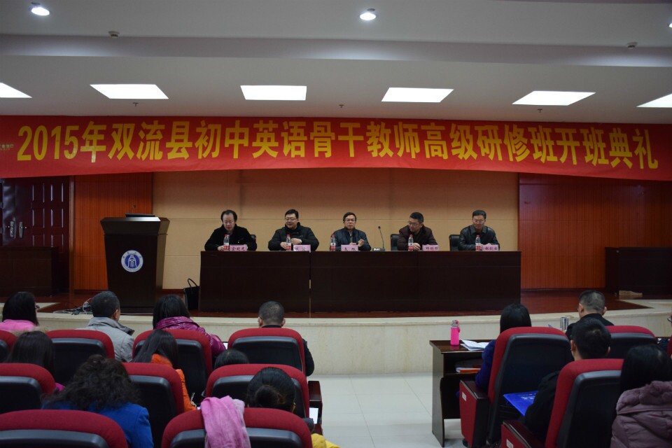 2月2日上午9点半,2015年双流县初中英语骨干教师高级研修班开班典礼在西南大学外国语学院隆重举行。出席典礼的领导有西南大学外国语学院院长文旭,西南大学外国语学院副书记陈渝,双流县研培中心主任邱刚田和双流县研培中心教师发展室主任赵剑云。双流县研培中心初中英语研培员程德金、双流县初中英语骨干教师高级研修班班主任和47名学员参加了典礼。西南大学网络和继续教育学院主任余晓光主持了本次活动。