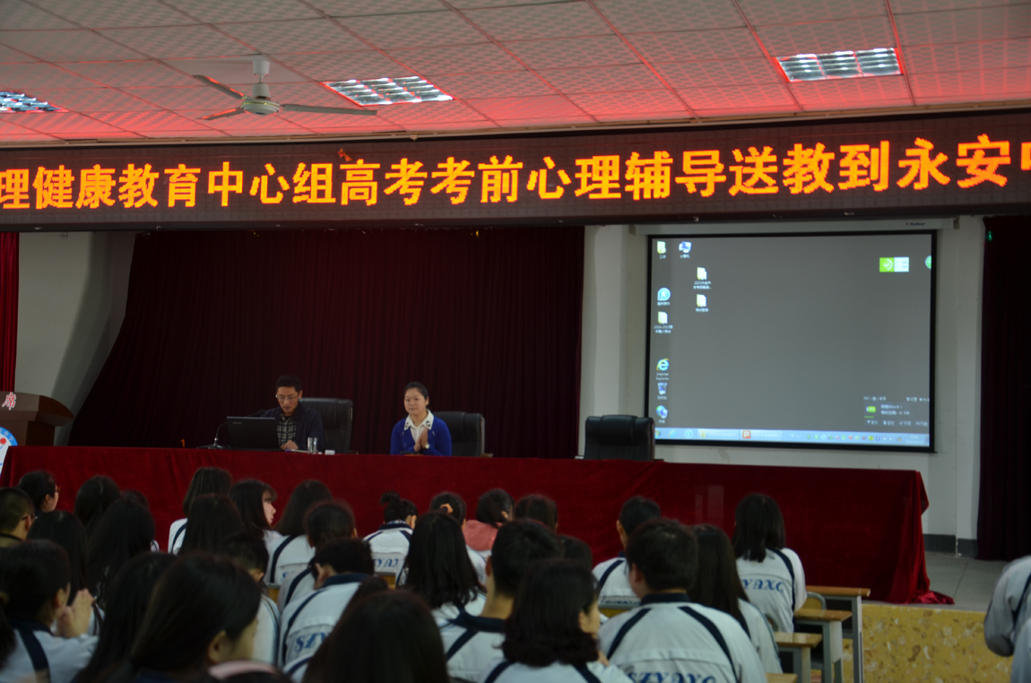 此次高三年级考前心理辅导是永安中学历年来最全面和立体的一次。活动也受到了学校、学生、老师和家长的一致好评,增强了高三年级信心,激发了学生动力,指导了教师和家长,为六月的辉煌提供了有力保障!
