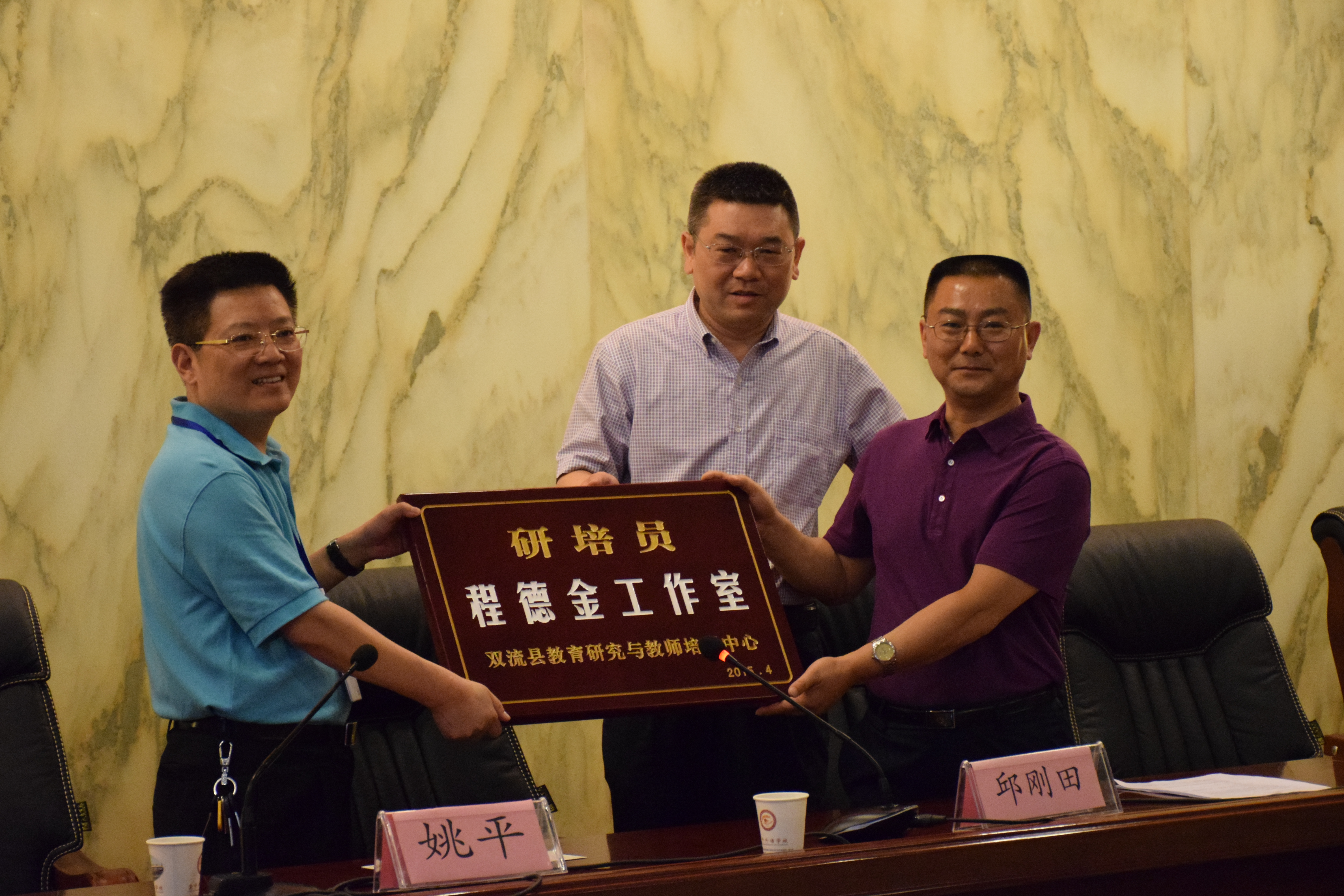 最后,研培中心主任邱刚田和棠外副校长姚平共同为双流县学科研培员程德金工作室授牌、颁发并宣读聘书。工作室导师程德金代表工作室全体成员接受了授牌和聘书。双流县学科研培员程德金工作室正式启动。