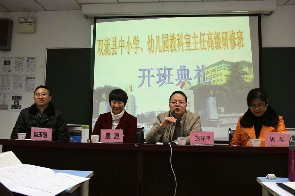 2015年12月20日上午,双流县中小学、幼儿园教科室主任高级研修班在西南大学教育学部顺利开班。本次研修班学习主题是“校本研修和课程建设”。开班典礼简短而热烈。会议由西南大学教育部胡琴老师主持,出席会议的有西南大学教育学部博士生导师、学部助理彭泽平教授、双流县研培中心理论室易恩主任、本期研修班班主任杨玉明老师。