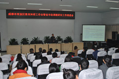 会议的第二个议程是研培中心理论室主任易恩就2016年双流区教育科研工作做了安排和指导。易主任总结了上年度双流区教育科研的发展及取得的成果,梳理了本年度教育科研的工作重心及要点,详细具体地指导了学校推进各级课题的要领。她提出了“系统规划 明确重点、注重积累 促进推广、规范管理 扎实研究”的工作要求;并进一步强调了课题选题的前瞻性、学术性和真实性,课题方案、报告的规范性,课题成果的精炼性,课题效果的推广性。易主任的讲话又一次对教育科研的内涵进行精准定位,对教育科研的规范操作进行通识培训,对课题开题、报告撰写、深入研究、成果提炼等环节进行了详实的培训指导。