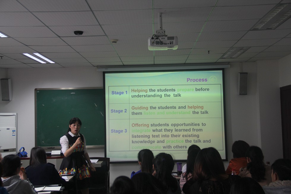 上课开始,PPT出现了一个独具个性的美女、一个摇篮和一位伟岸军人的三幅常见的图片素材,黄学军教授独特名字的由来让我们初感“故事”的魅力,在不知不觉中走进了“英语故事在小学英语教学中的运用”这高端的殿堂。故事教学既符合课程标准同时符合小学生的认知特征。它不仅可以激发学生学习兴趣,培养学生的语言表达能力,从而使学生获得成就感,而且在故事学习中可以很好的培养英语语感。更重要的是故事教学能够很大程度上培养学生的多元智能。黄教授还从教学目标的设定,教学理念的达成,教学思路的搭建以及教学过程的实现这四个方面并结合案例为我们展开了“小学英语对话教学策略”的剖析。点,线,面的解析让在座的每个老师茅塞顿开,受益匪浅。