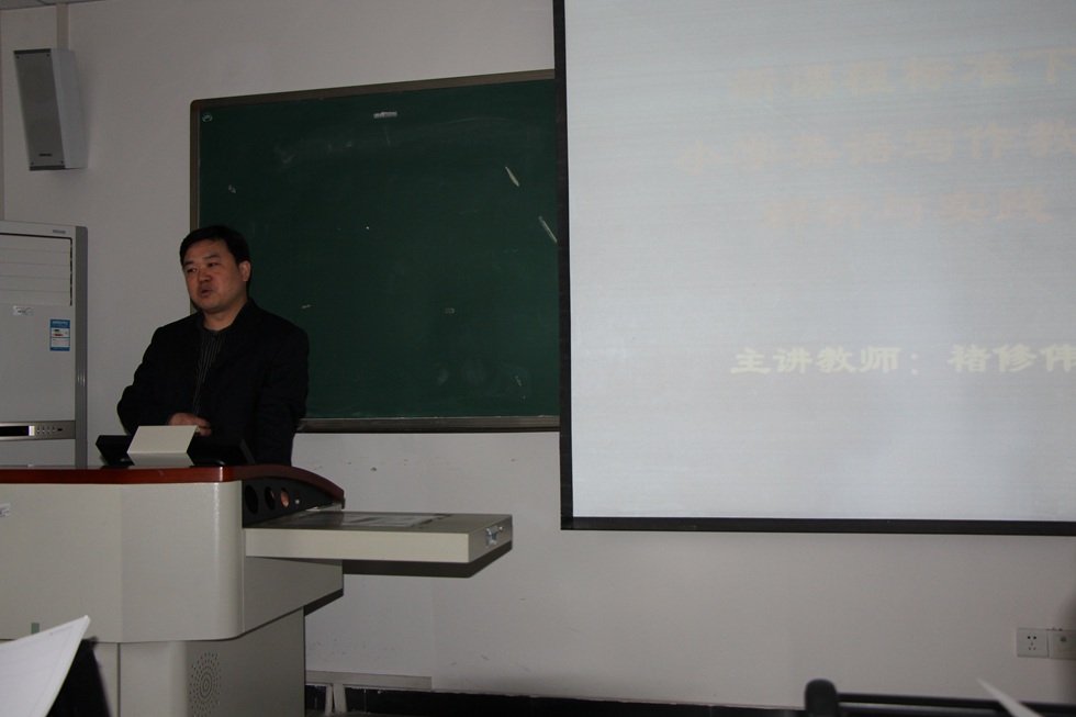 4月10日上午,来自西南大学外国语学院的褚修伟教授为大家带来了“关于新课标下小学英语写作教学解析与实践”的精彩讲座。在讲座中,褚教授对小学英语写作教学作了全方位的深度讲解,内容包括:新课标中关于小学英语写作教学的目标要求,教师对自身写作教学的认识与反思,写和听、说、读的关系,引导学生养成良好的学习习惯,新课标关于写作教学的理念与实施建议,写作任务的设计,写作案例参考以及参考资料,新课标关于学习成果评价的理念与实施建议以及写作成果的批改方式等方面。这样一堂内容丰富的高水准讲座让大家受益匪浅,我们意识到了应该转变教育教学理念,找准角色定位,作学生的向导,改进教学方法,帮助学生掌握正确有效的学习方法。