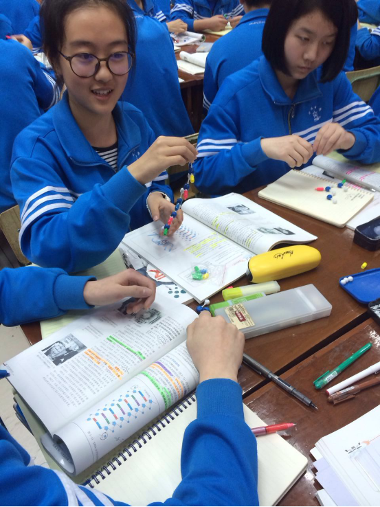 活动的第二环节是由双流中学的陈维老师展示《DNA分子的结构》研讨课,参会的教师都进行了观摩。在研讨课上,陈老师优雅的教姿教态、标准的普通话发音以及淡定从容地把控课堂节奏的能力深深让在场的每位老师折服。她先以当下最流行的韩剧《太阳的后裔》中的地震片段引入DNA分子具有多样性的原因,充分调动了学生的积极性,然后以脱氧核苷酸的结构、脱氧核苷酸连接成单链、再连接形成双链以及空间结构为主线引导学生以实物模型构建DNA双螺旋结构。在构建模型的过程中,学生遇到问题时采用小组讨论、组间交流、教师点拨等方式及时解决,然后通过比较不同组的学生构建出的模型,老师提醒学生注意DNA分子结构的特点。可以说整堂课中,陈老师游刃有余地引导学生在活动中学习、在学习中成长,将微观抽象的、枯燥的基础知识贯穿于多彩的模型构建活动中,让学生不仅收获了知识,也提升了动手、语言表达以及与人沟通的能力。