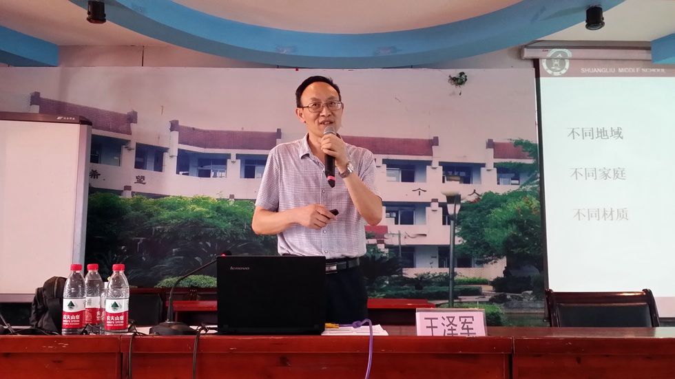 下午,成都市特级教师、双流区名师工作室导师、双流中学研培处主任王泽军为大家带来了题为《守公正 用真心 育真人》的讲座。王老师提出守公正是前提,用真心是方法,育真人是目的,教导青年教师们在教师岗位上要勿忘初心,坚守本心。不论是在哪个班级,学生们都是来自不同地域和家庭,每个学生资质不同,无论远近亲疏,要一样的“冷暖”;无论贫富贵贱,要一样的“表情”;无论贤愚美丑,要一样的“尊重”。公生明,廉生威,阳光课堂是教育的最大公平。真心包括良心、爱心、细心、耐心、恒心等方面,教师唯有以真心育人才能收获学生的尊重。育真人是指在平时的工作中,如班会课、活动课、个别谈话、学科课程等做好品德教育,润物细无声。