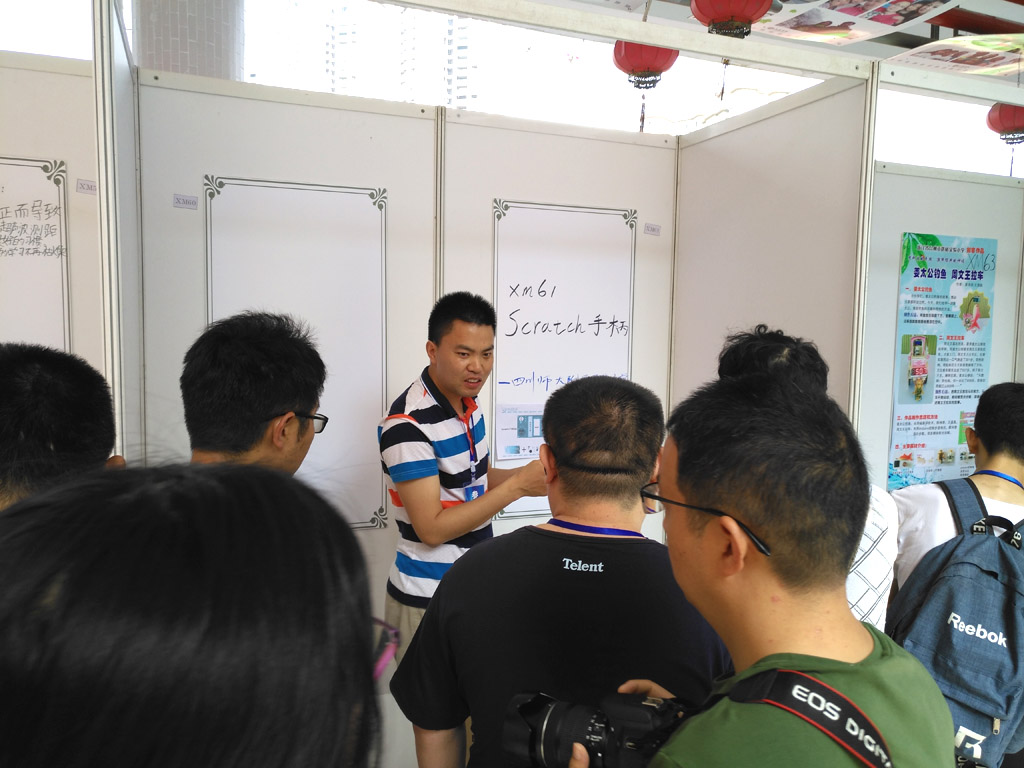 本次活动设置了机器人教学基本功竞赛和校园创客作品展两项评比活动,共有18个省市区报送参赛选手和创客作品,覆盖了所有一线城市和沿海发达省份,选手素养和创客作品的数量和质量均比往届有明显提高,赢得参会代表的高度认可。通过说课比赛和机器人操作技能挑战赛两个环节,双流区推出的东升小学孙建成老师以优异的成绩荣获机器人教学基本功竞赛一等奖。圣菲小学推送的学生创客作品“Scrach游戏手柄”荣获二等奖,指导教师张子红还应邀在机器人与创客教育论坛上作《小学STEAM课程实践研究》的专题发言。