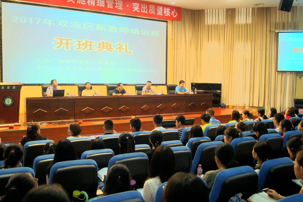 8月25日至26日,由双流区教育局主办,双流区教育研究与教师培训中心承办的2017年双流区新教师培训在棠湖中学新校区成功举行。参加此次培训的有2017年双流区从大学毕业生中公招的新教师,2017年招募的高校毕业生服务基层项目支教志愿者2017年各公办学校、民办学历学校、公益性幼儿园从大学毕业生中自主招聘的新教师共300余人。参加开班典礼的有区教育人才交流中心主任江世海,区教育研究与教师培训中心主任邱刚田、副主任谢祖福、教师发展室主任赵剑云,区实验小学东区校长、四川省特级教师、双流区名教师工作室导师周晓玲,成都市特级教师、双流区名教师工作室导师、双流中学研培处主任王泽军,新教师任职学校分管教师培训工作副校长或教师培训部门负责人。开班典礼由区教育人才交流中心副主任付祥波主持。